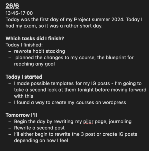 By following the 7 steps above, you’ll create accountability and get a better structure. Both are things that can improve your productivity. Below is an example of one of my entries in my today and tomorrow productivity journal.