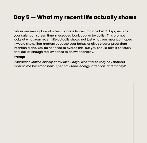 You will look at the real traces of your life – your time, attention, choices, and repeated behaviors – instead of relying only on memory or intention.